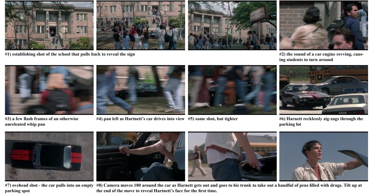 In Three O’Clock High, a notorious new transfer student (played by Richard Tyson) challenges a meek reporter from the school paper to an after school showdown. Tyson’s legendary delinquent Buddy Revell gets not one, but two memorable introductions. In the first (pictured below) the camera pulls back from the giant clock outside the school and then follows various students as they detail Revell’s rumored exploits – with each new group of students picking up the gossip where the last group left off. The long tracking shot ends inside the school as the camera pushes in to the school store where Casey Siemaszko’s character works.