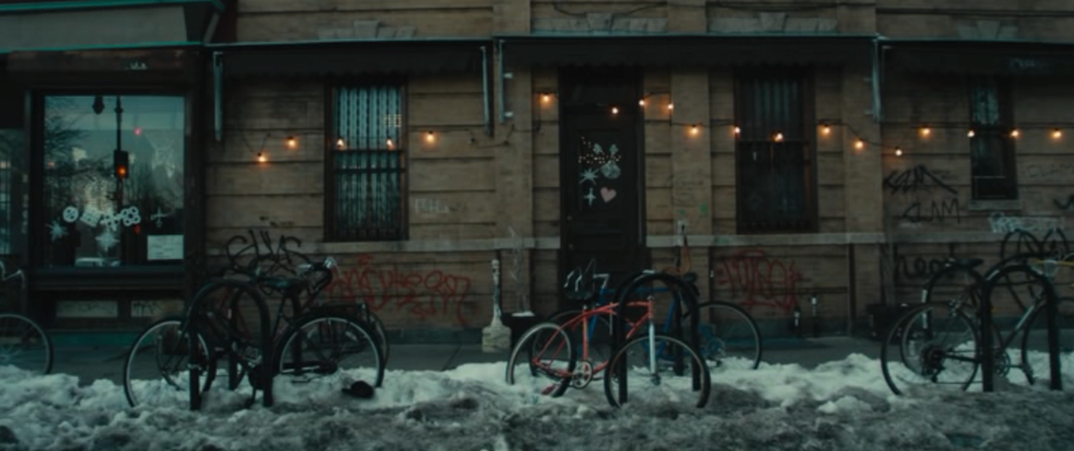 We wanted something simple and relatively unadorned for the comedy club scenes. We actually borrowed a lot from the scene in Annie Hall where Diane Keaton’s character is singing in the club. The purple color comes from that. We didn’t want it to feel like the club had spent too much time thinking through how the space would look, so we tried not to space lights evenly. That space (Trash Bar in Williamsburg) had a lot of red in it already and it felt right to add that into the scene.