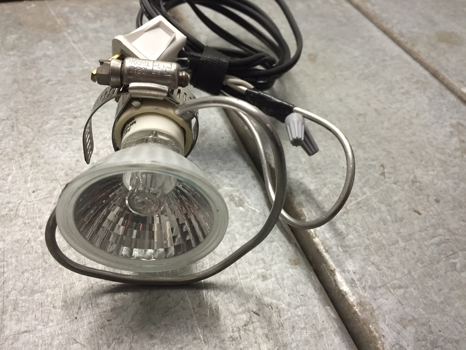 My new favorite thing is this tiny little spotlight that I built, which is basically a hose clamp around a loop of armature wire and a ceramic MR16 light bulb base. MR16 bulbs are the same things used in track lighting, and if you get the ones with a GU10 base you can wire them up directly to a 110V plug. They are so light that you can paper tape them to walls or ceilings and they are so small that they can be in the background of bar scenes and not look like a movie light. I have a whole box of them and they are very cheap to make. Just be safe and careful with your wiring.