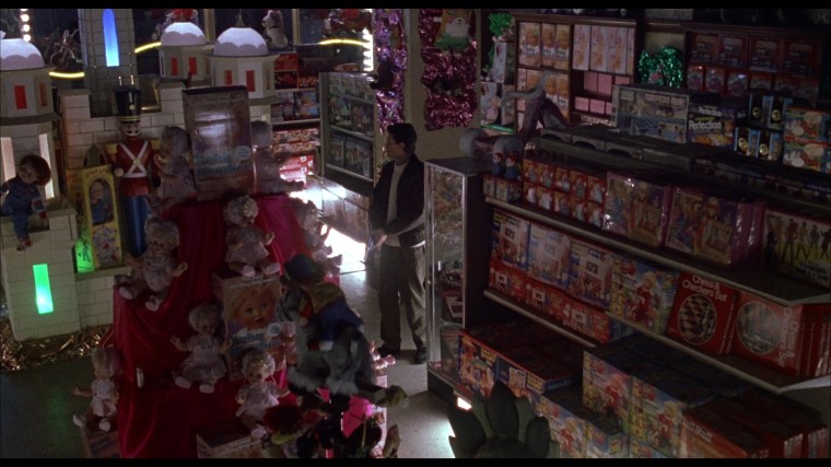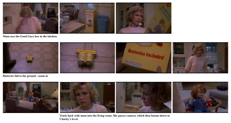 My favorite moment in Child’s Play – the reveal where Andy’s single mom discovers he hasn’t been lying about the doll’s murderous deeds. The info is delivered in purely visual terms – mom picks up the doll’s box and the included batteries fall to the ground.