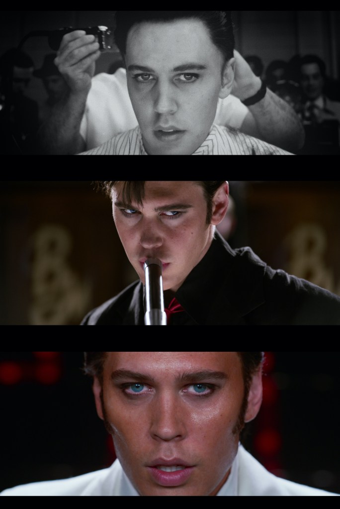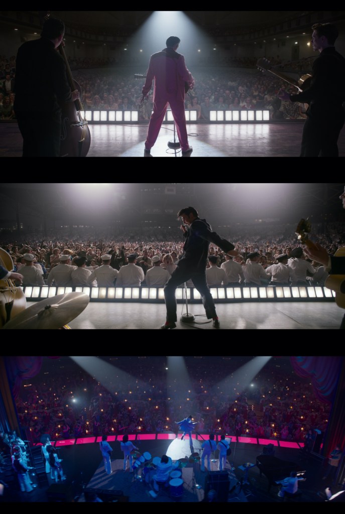 Walker: We had four cameras and I think we shot there for three days. One day we’d be backstage, one day we’d be on the side of the stage, then one day we’d be in front of the stage. That was such an important show for the drama of the movie, with the Colonel up in the gantry on the side of the stage watching Elvis. It’s also where you really see the reaction of the audience to him performing. It was all meticulously planned and rehearsed during prep. Baz does storyboards, but all the concerts were dress rehearsed with the cameras in prep quite a few times to plan out all the shots. During the rehearsals Baz and I would stand there with the four monitors in front of us making adjustments to the shots.