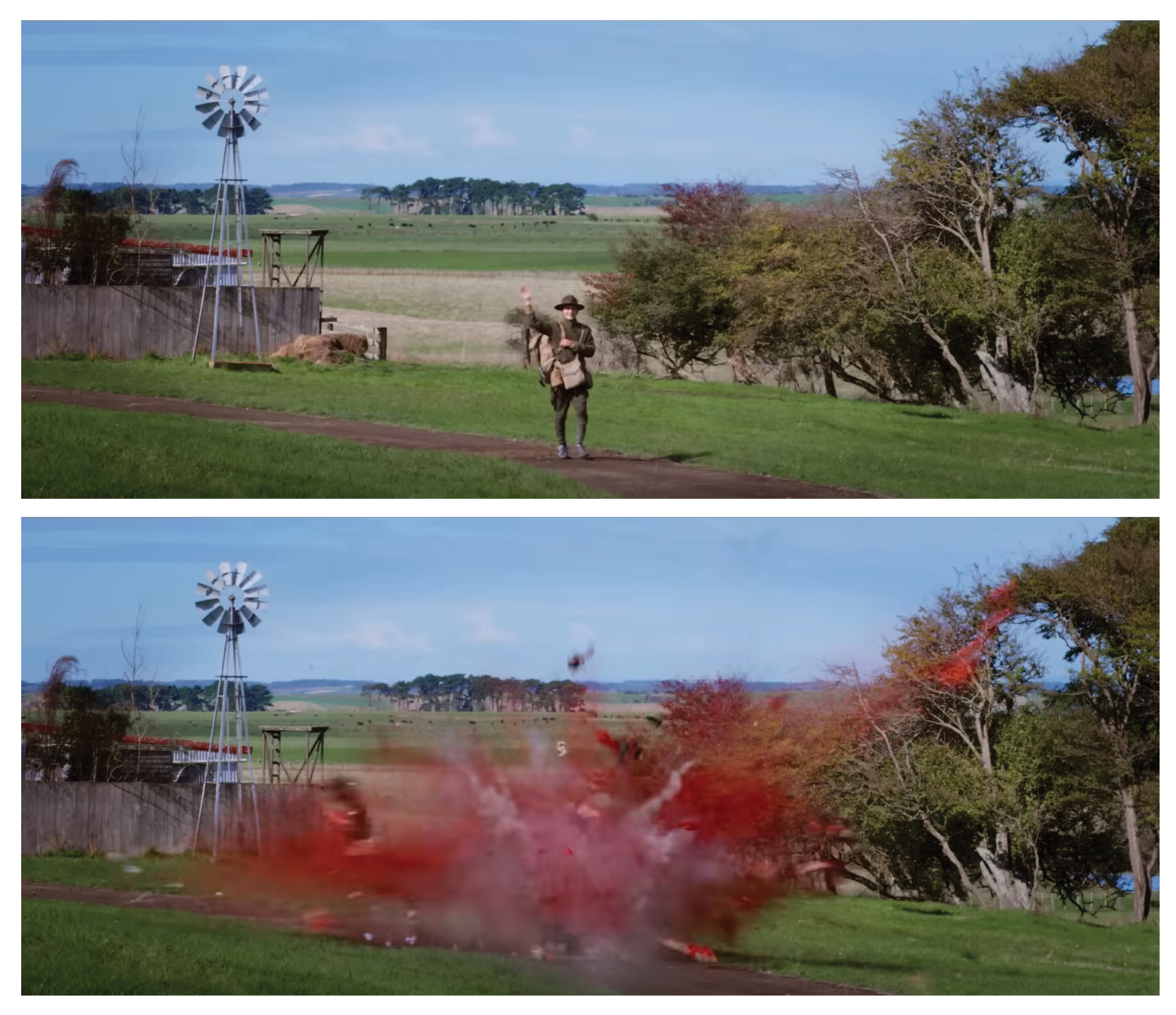 Rockett: We locked off the camera and had the actor walk in and stop on the mark where he was going to wave and then explode. Then, with the camera still locked off, the special effects guys put in a dummy on that same mark with all the blood and guts and explosives in it, and we blew it up. Those two shots are sewn together in the VFX world so that it works perfectly.