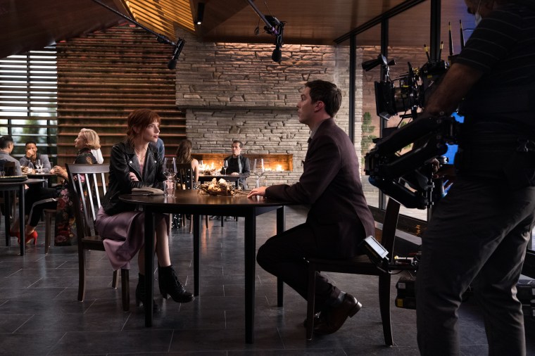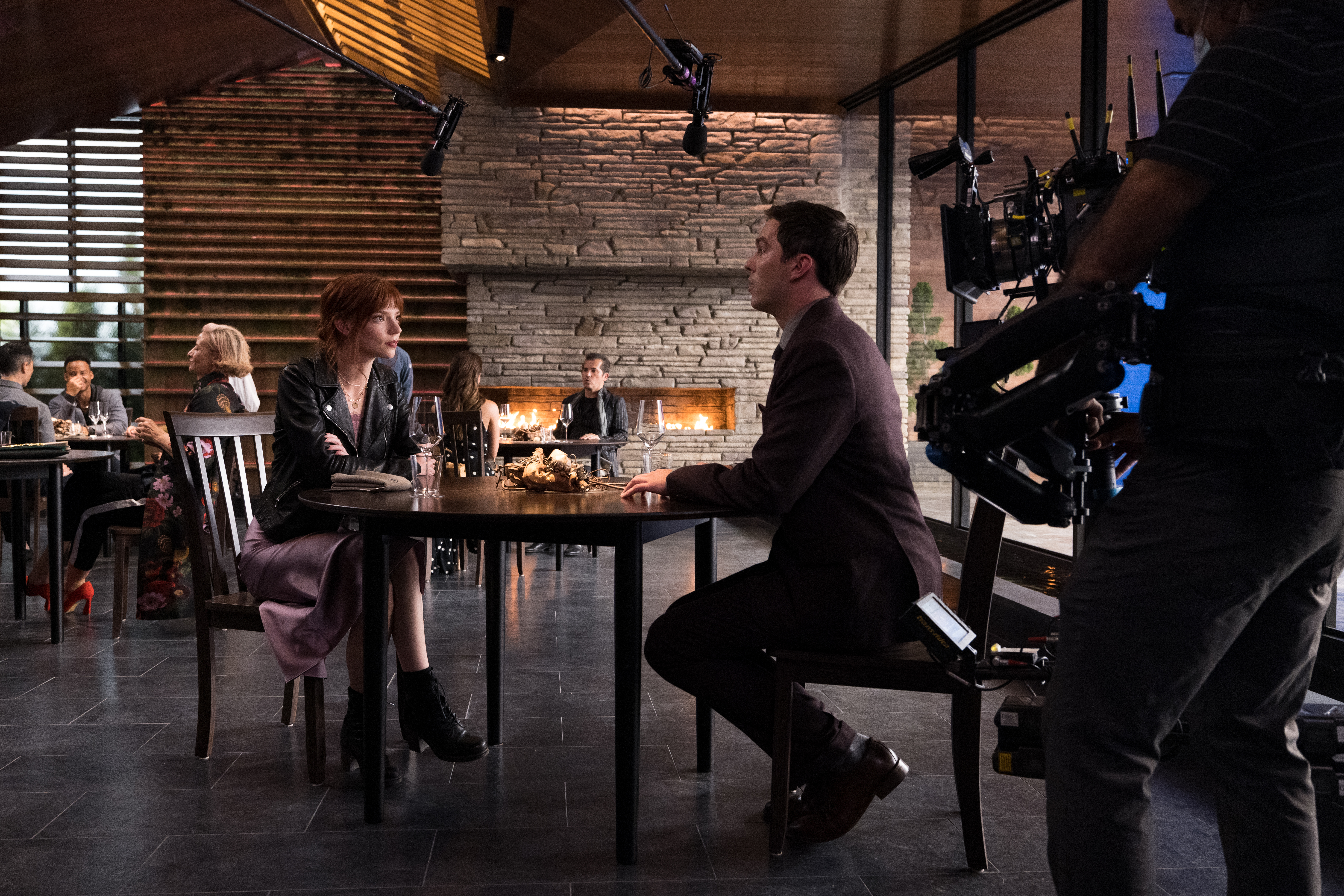 Deming: It was a big nightmare. The windows gimbaled, but only left and right, not up and down. [Being able to shift the angle of the windows] certainly helped, but at the same time if you gimbaled them too much then you had the same reflection in four different windows, which I think subconsciously to a viewer feels like a hall of mirrors. Suddenly you’re in The Lady from Shanghai. So, consequently, most of the lights were above frame. Occasionally we would lower them and hang a flag or teaser to hide it, but it was difficult to do that and have the light still do what it needed to do. What was interesting about it is that everyone was always on screen, even the kitchen staff, because they’re all in the reflections. So, they all had to keep doing what they were doing, and they had to match continuity.