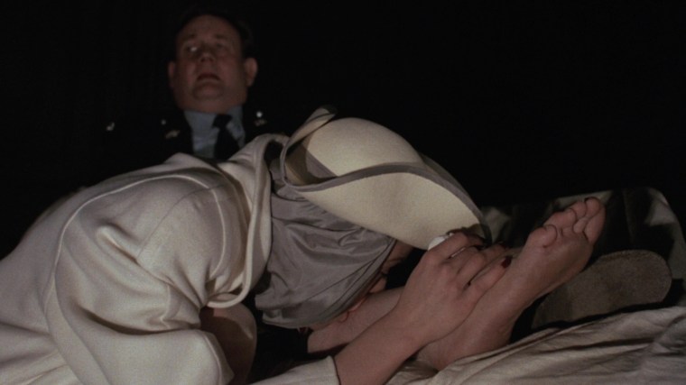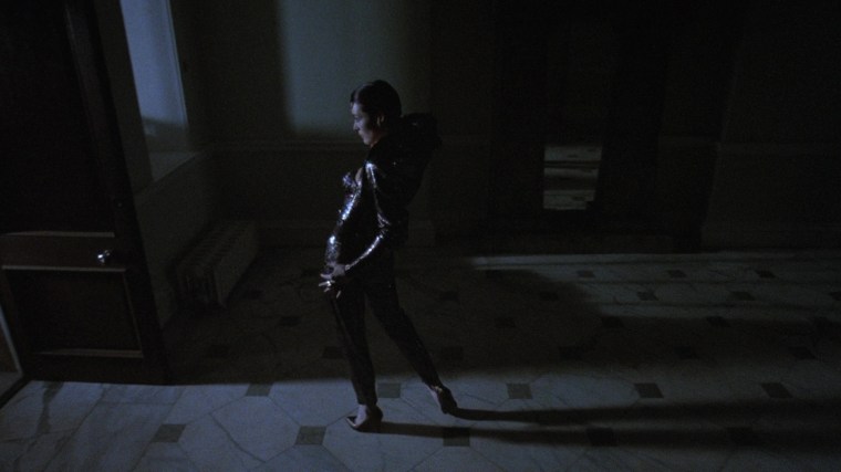 “At first it wasn’t in the script because I didn’t think it was necessary, but when the film was pretty well cut together – though we were still shooting – I decided we needed a little more exposition about what had happened and who was who and what was what. Unfortunately, there was very little money left in the budget – enough for just four flats all screwed together and four bits of tacky furniture covered in white sheets, which cost very little. But I think it gives a rather macabre effect, especially as our starlet is in white also.”