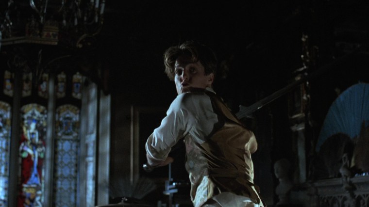 Hugh Grant uses his family’s ancestral sword to smite a vampire.