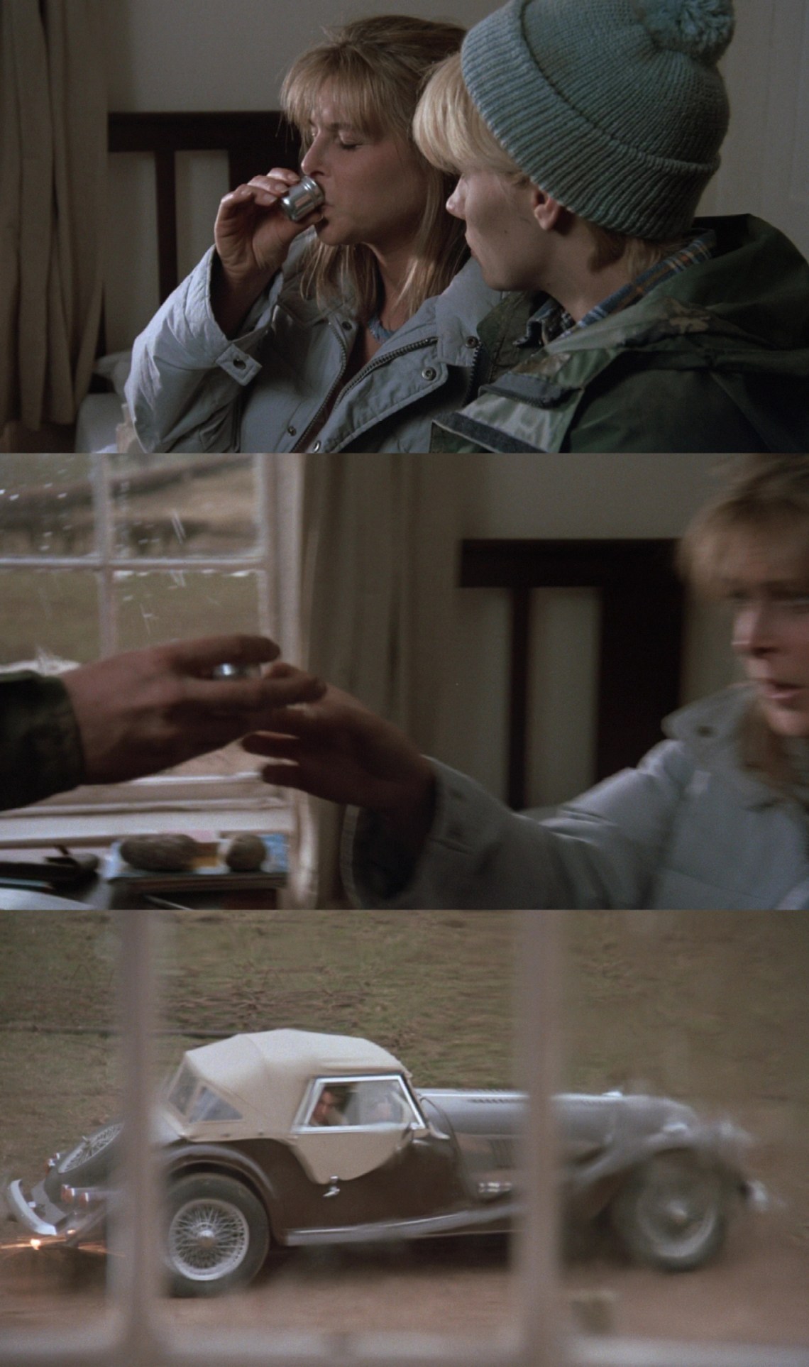 ‘The Lair of the White Worm – pan left and then zoom in out the window to Grant’s car’