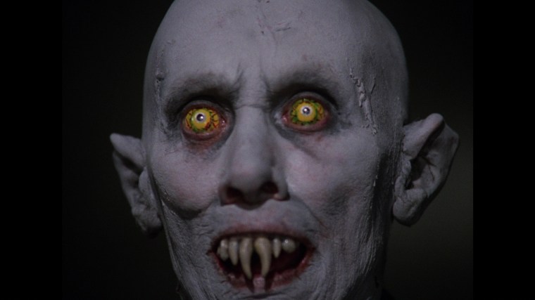 “What we’ve tried to do in everything from our vampires to our head vampire was to be different. We’re using a remarkable contact lens which is like half a ping pong ball, fits over the whole eye, and can only be worn for 15 minutes at a time before it has to be removed to let the eye rest for 30 minutes. They’re not just bloodshot eyes. I wanted an effect like the eyes in Village of the Damned and its sequel Children of the Damned. I wanted them to be sick and decayed and, I hate to use the word but. . .pus-filled. We also added one element which had not been done before: we put a reflective material in the contact, and when we turn our lights on it, they glow back at us. That way we didn’t have to do burn-ins, we didn’t have to do opticals, all of which you never have the amount of time to do thoroughly.” (#1)