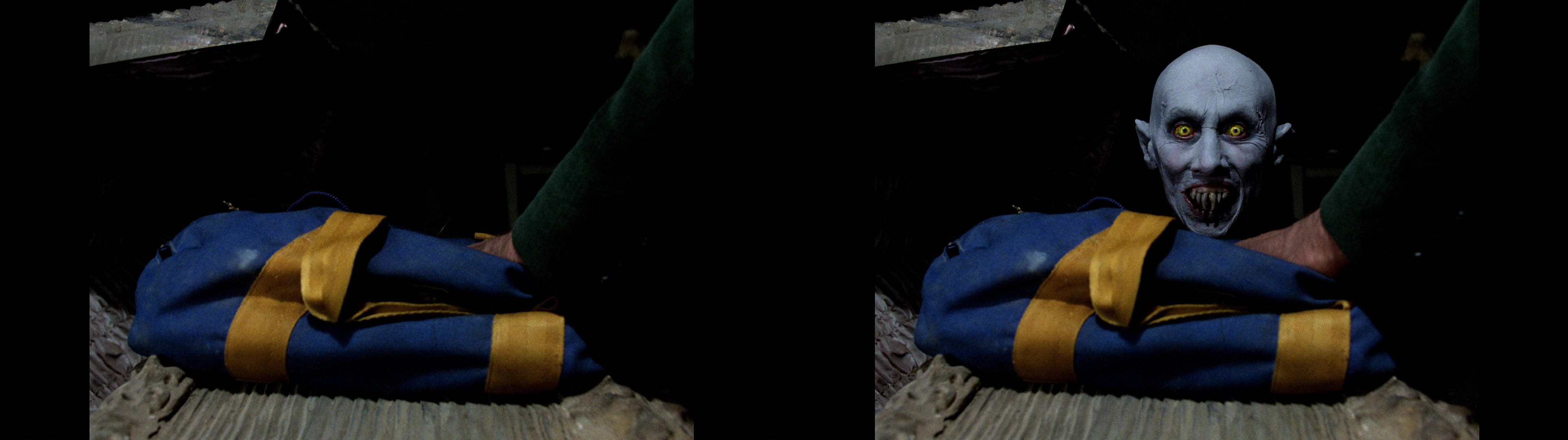 This shot of the vampire popping up out of his coffin was also achieved by shooting the action backward (i.e. the actor starting upright and then lying back) and reversing the footage in the edit.