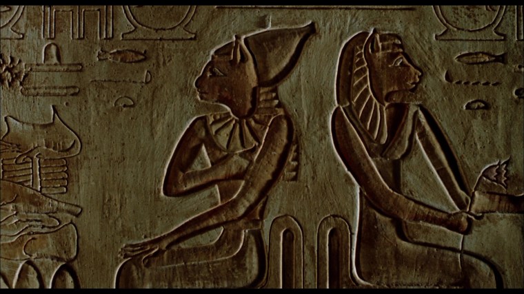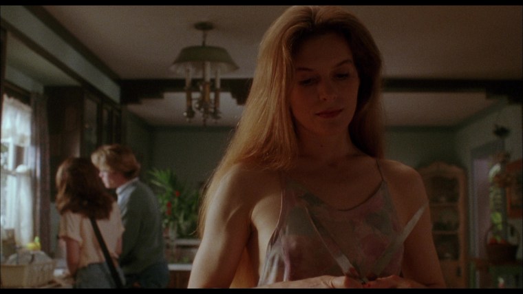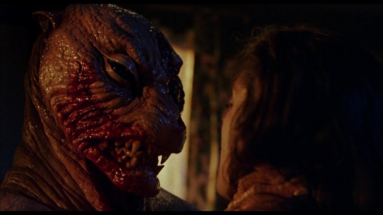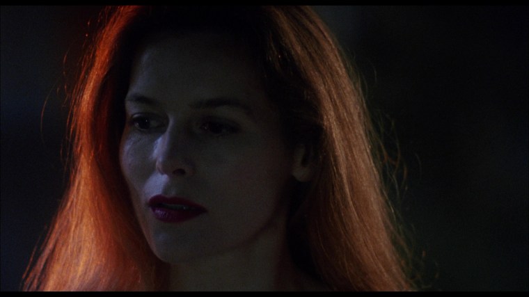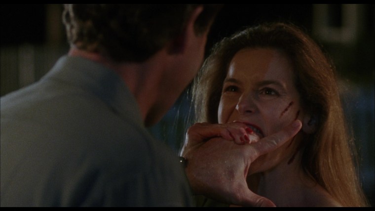 The true nature of the titular cat people is revealed in an incestuous sex scene between Krause and Alice Krige that employs an old school sleight of hand trick. When the camera tilts up from the lovers on the bed to the mirror (bottom row), the mirror frame is actually empty and on the other side is a version of the bedroom set built in reverse with two actors in the cat creature make-up. Garris had hoped to do the whole gag in a single shot, but the MPAA had other ideas.