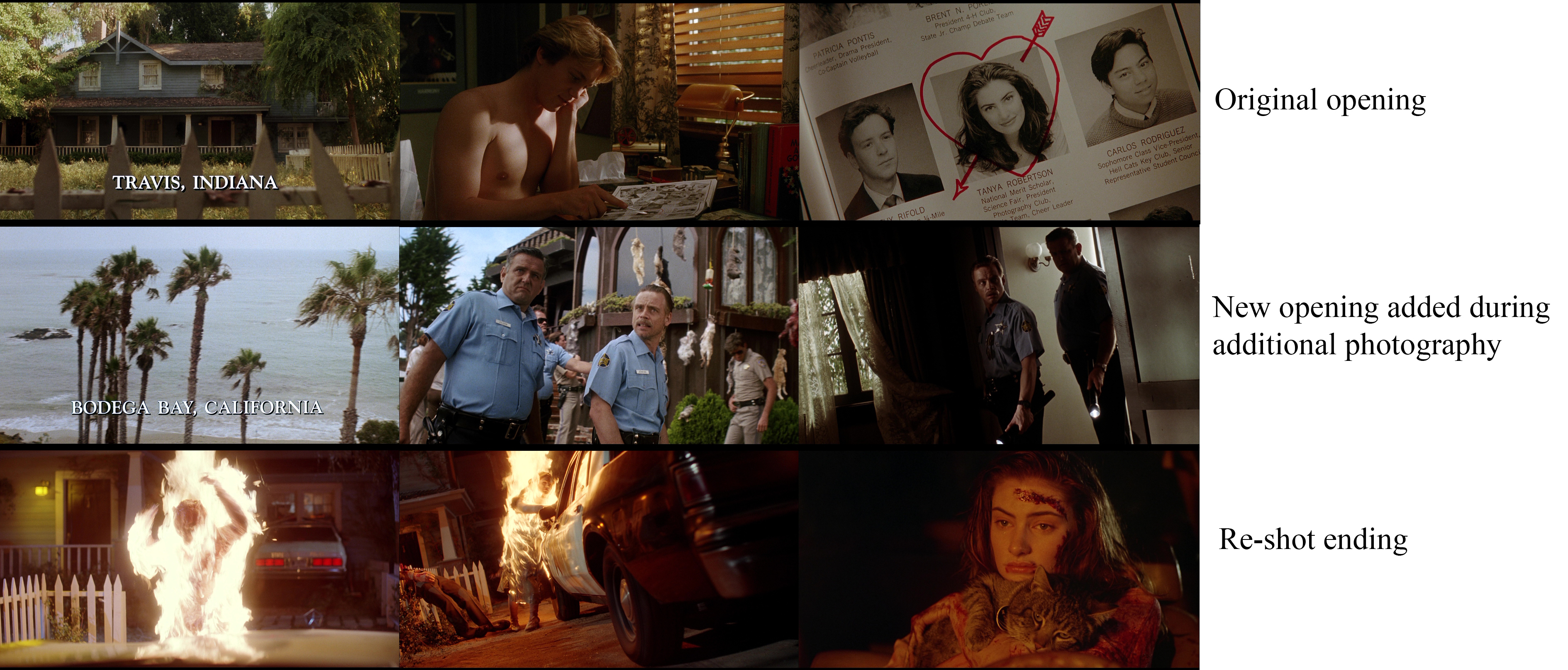 After principal photography wrapped, a new ending was re-shot and an additional introductory scene was added. Originally, the film opened with an establishing shot of a Travis, Indiana house before cutting inside to find Brian Krause pining over Mädchen Amick in a school yearbook. The exteriors used the house from The Waltons TV series on the Warner Bros. lot, while the interiors were done on stage on the Columbia lot.